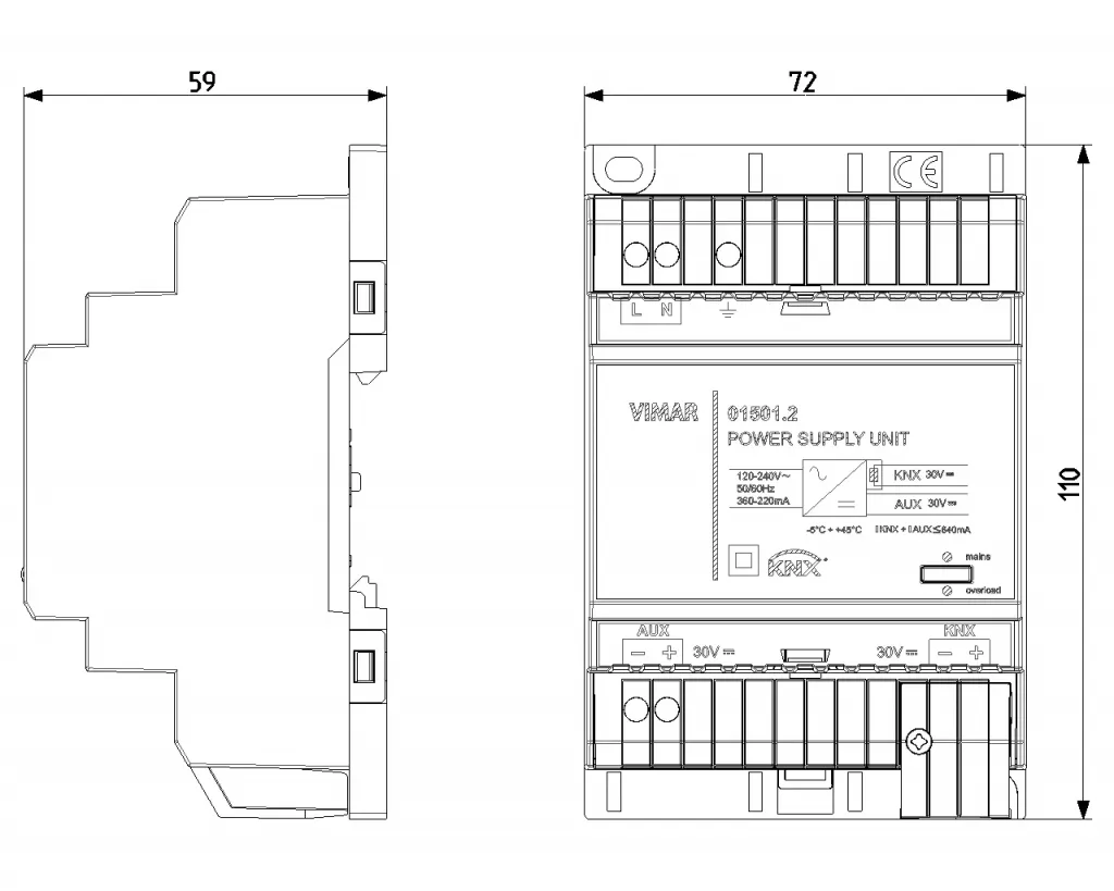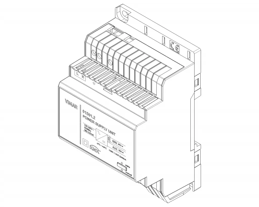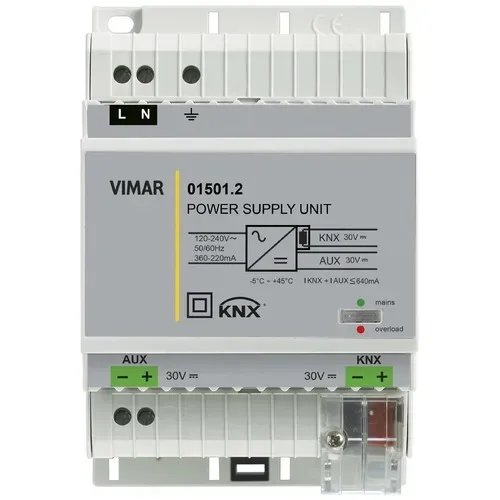 01501.2 Блок питания Vimar Arkeс с выходной шиной 30 В пост. тока 640 мА, вспомогательный выход 30 В пост. тока, питание 120-240 В ~ 50/60 Гц, с катушкой расце- пления, стандарт KNX, 4 модуля