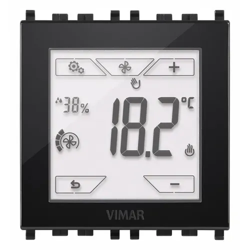 02951.BN Термостат Vimar Arke металл с сенсорным экраном с режимами работы ON/OFF, PWM и PID для 2- и 4-трубных систем, для управления фанкойлом с 3 скоростями и пропорциональным, 1 вход для подключения датчика NTC - 2 модуля