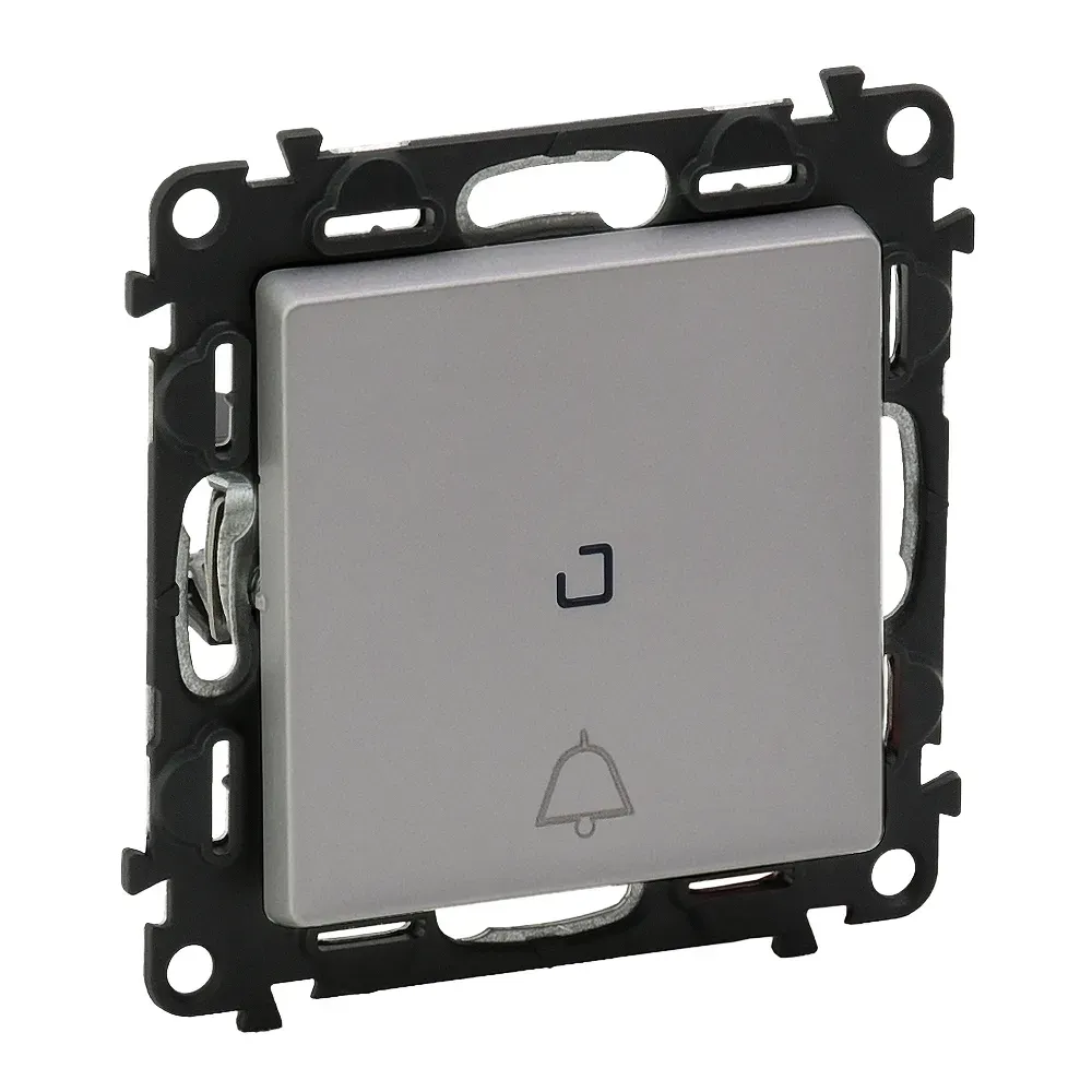 752316 Valena LIFE. Выключатель кнопочный 6А 250В. Безвинтовые зажимы. С лицевой панелью с символом "звонок",с подсветкой. Алюминий Legrand