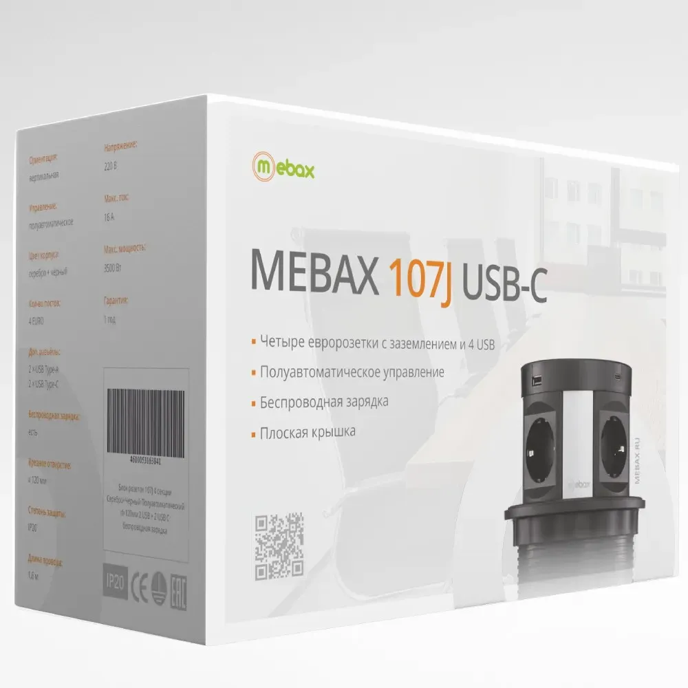 Блок розеток 107J (4 секции, 2 USB А + 2 USB С) Mebax 00-00001464