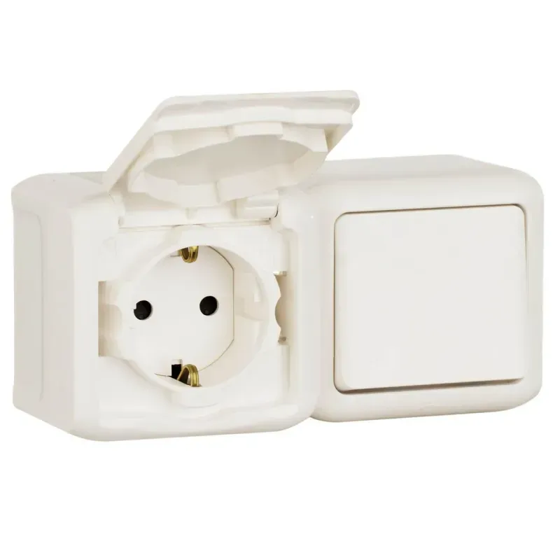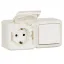 Блок выключатель одноклавишный и розетка 2К+З Legrand Quteo 16A 250V с/з со шторками крышкой IP44 белый 782318