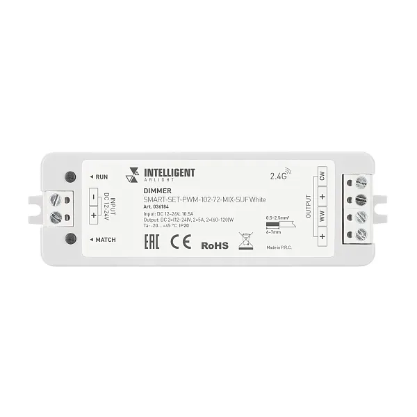 Диммер Arlight SMART-SET-PWM-102-72-MIX-SUF White 12-24V, 2x5A, ПДУ RING 10кн, 2.4G 036184