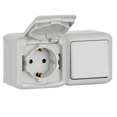 Блок выключатель одноклавишный и розетка 2К+З Legrand Quteo 16A 250V с/з со шторками крышкой IP44 серый 782348