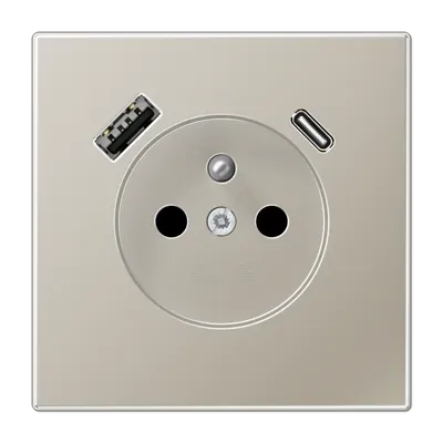 ES1520F-15CA-L Нержавеющая сталь Розетка франко-бельгийской системы, 1 гнездо USB типа A и 1 гнездо USB типа C Jung LS серия
