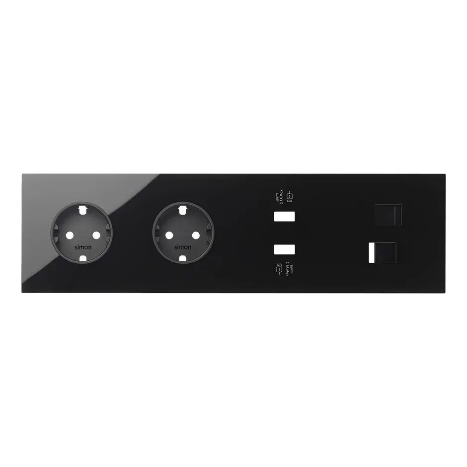 Кит на 3 поста, фронт: накладка на 2 розетки Schuko + 2 з/у USB SC черный глянец Simon 100, 10020309-138