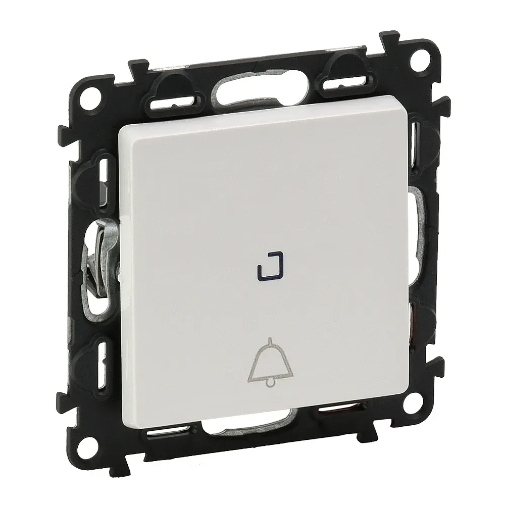 752116 Valena LIFE. Выключатель кнопочный 6А 250В. Безвинтовые зажимы. С лицевой панелью с символом "звонок",с подсветкой. Белый Legrand