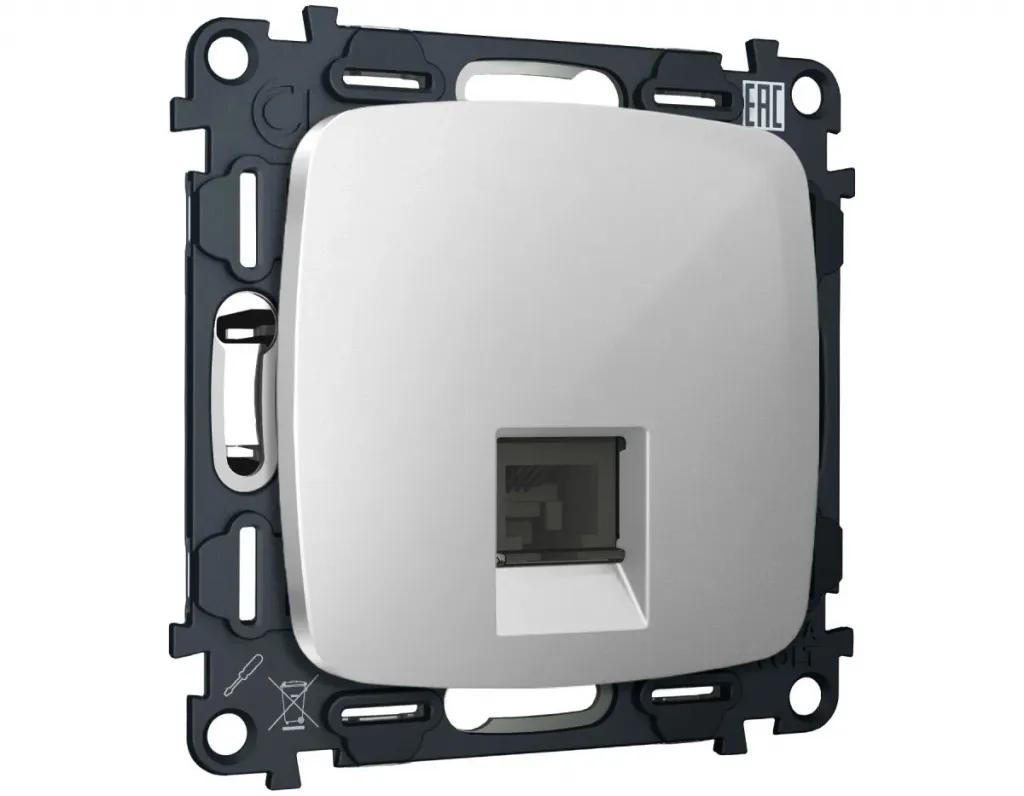 Комплект механизма компьютерной розетки Ambrella Volt RJ-45 (8P8C) CAT6A экранированной с автоматической защитной шторкой OMEGA MO412005 Серебро глянец QUANT (OP4120, VM185)