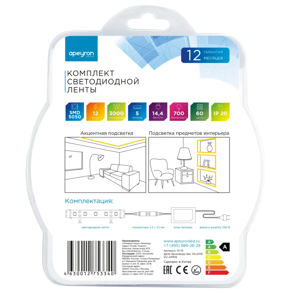 Комплект светодиодной ленты Apeyron 12В 14.4Вт/м smd 5050 60 д/м IP20 5м 3000K (блок, коннектор) 10-15