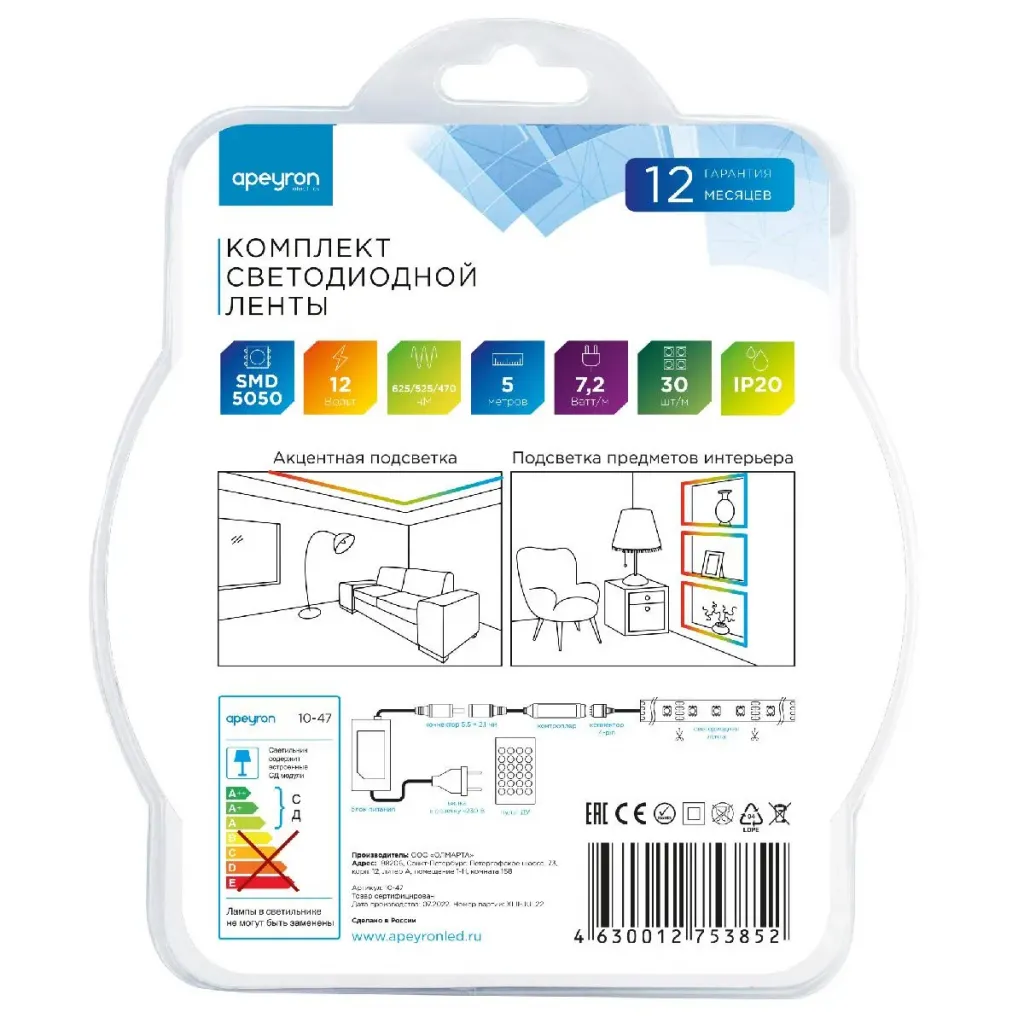Комплект светодиодной ленты Apeyron 12В 7,2Вт/м smd5050 30д/м IP20 300Лм/м 5м RGB (адаптер питания, коннектор, контроллер, пульт) SL-47