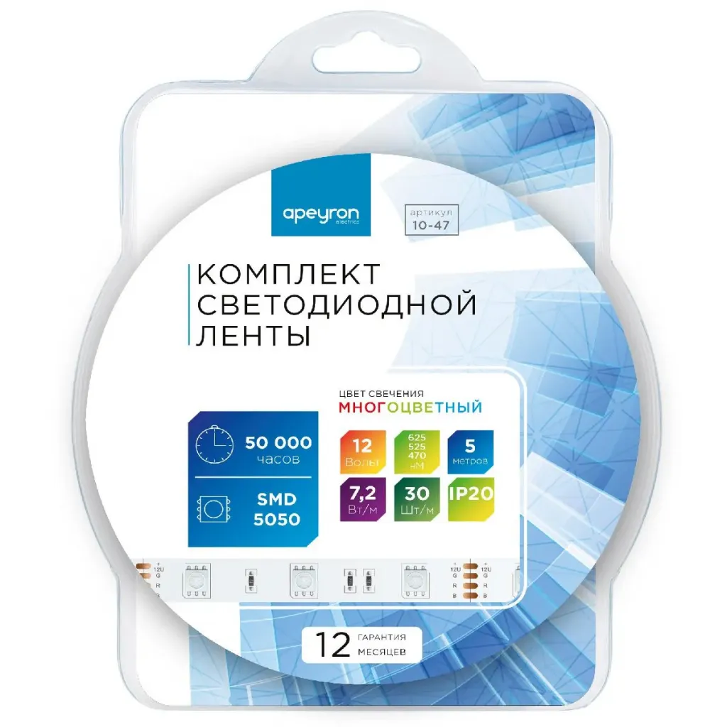 Комплект светодиодной ленты Apeyron 12В 7.2Вт/м smd 5050 30 д/м IP20 5м RGB (блок, коннектор, контроллер) 10-47