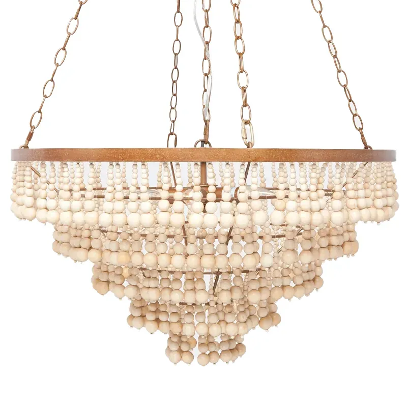 Круглая многоярусная люстра с круглыми деревянными подвесками Wooden Beads Chandelier Cream