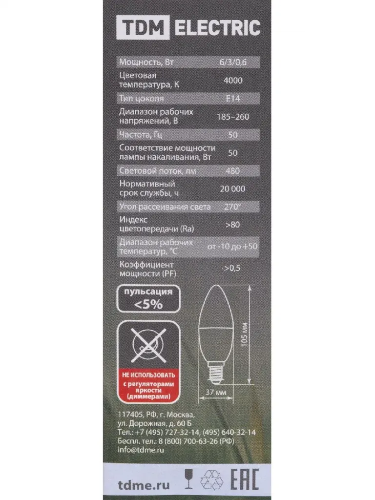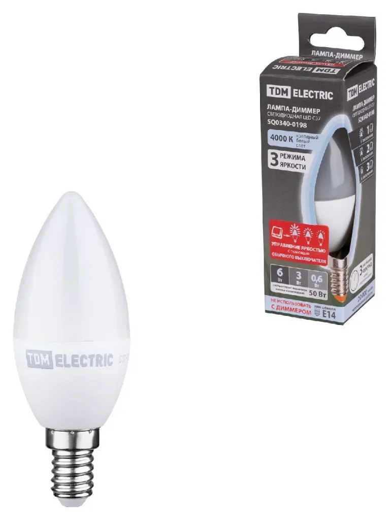 Лампа светодиодная диммируемая TDM Electric Е14 6W 4000K прозрачная SQ0340-0198