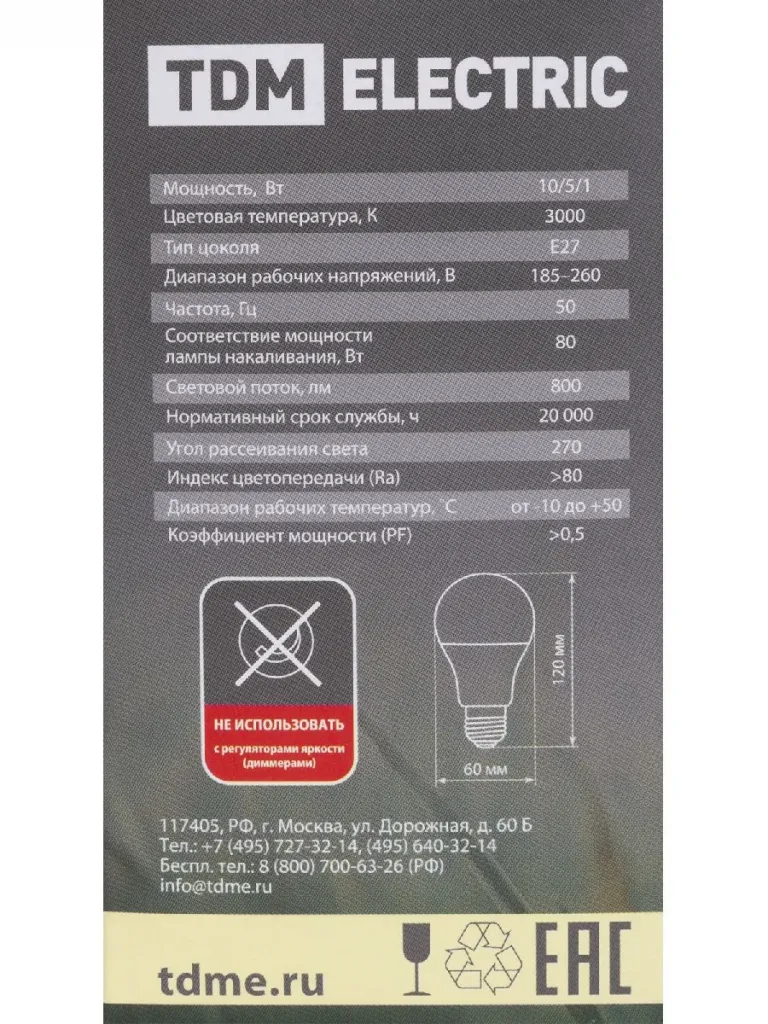 Лампа светодиодная диммируемая TDM Electric E27 10W 3000K матовая SQ0340-0197