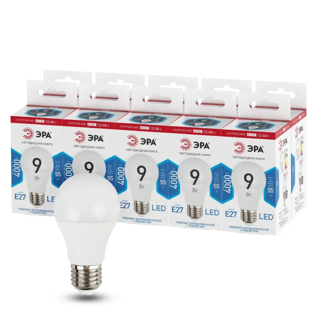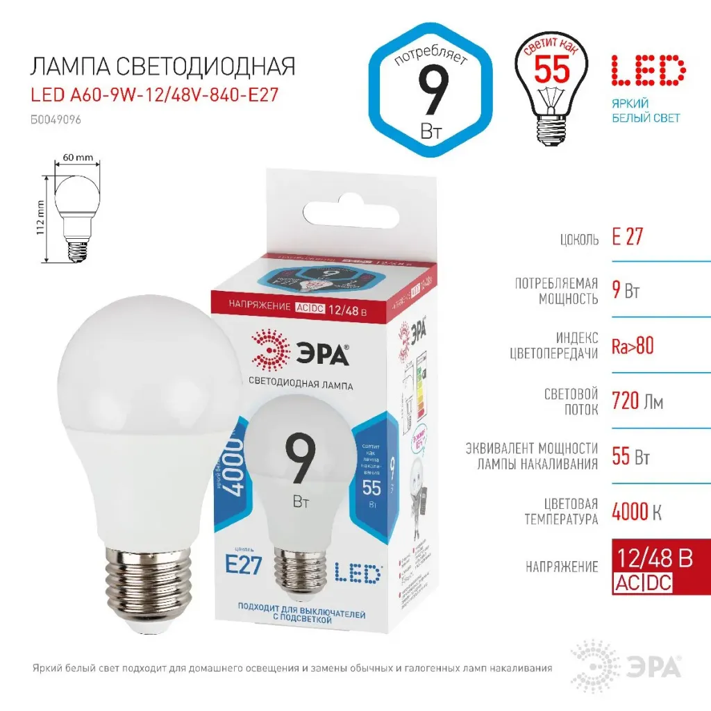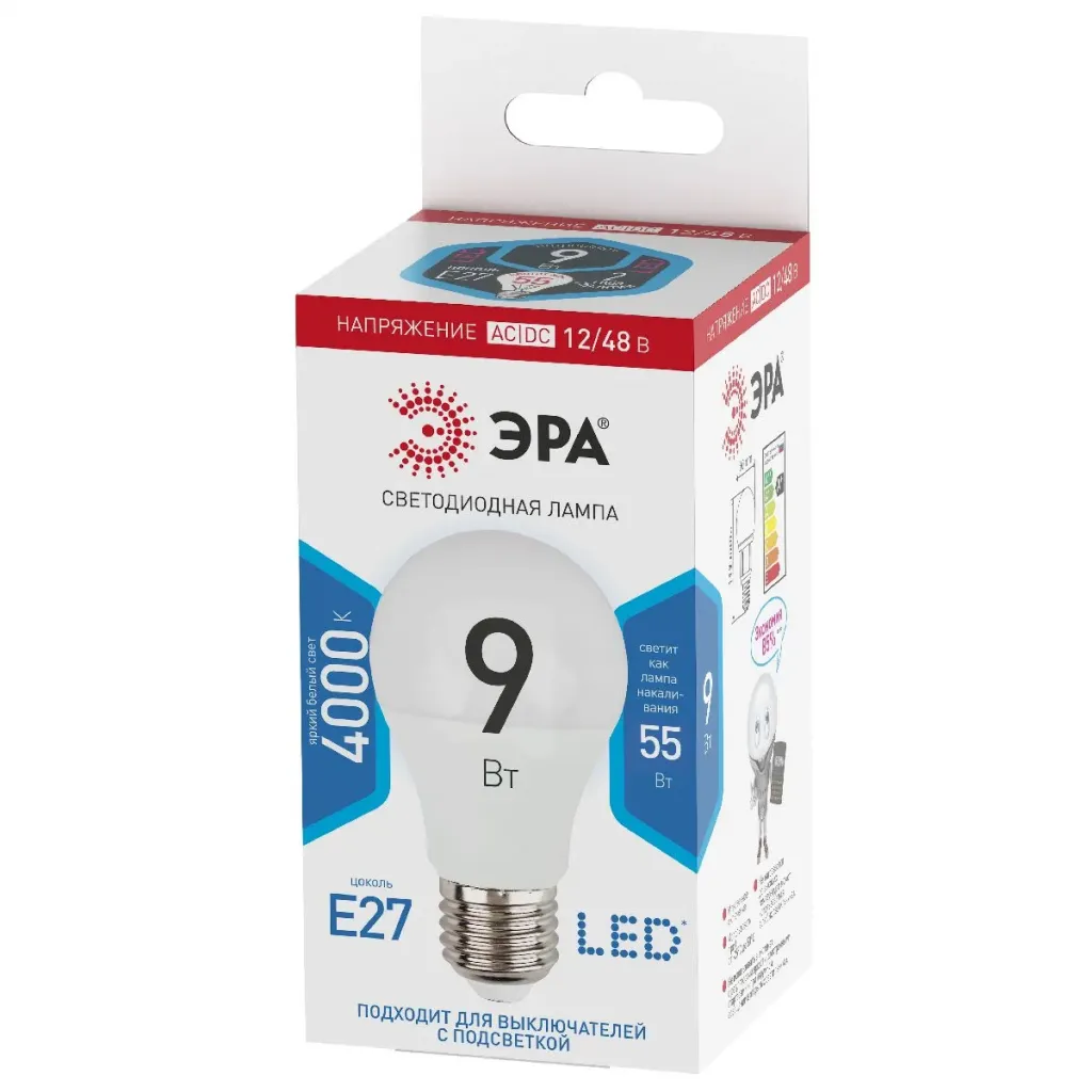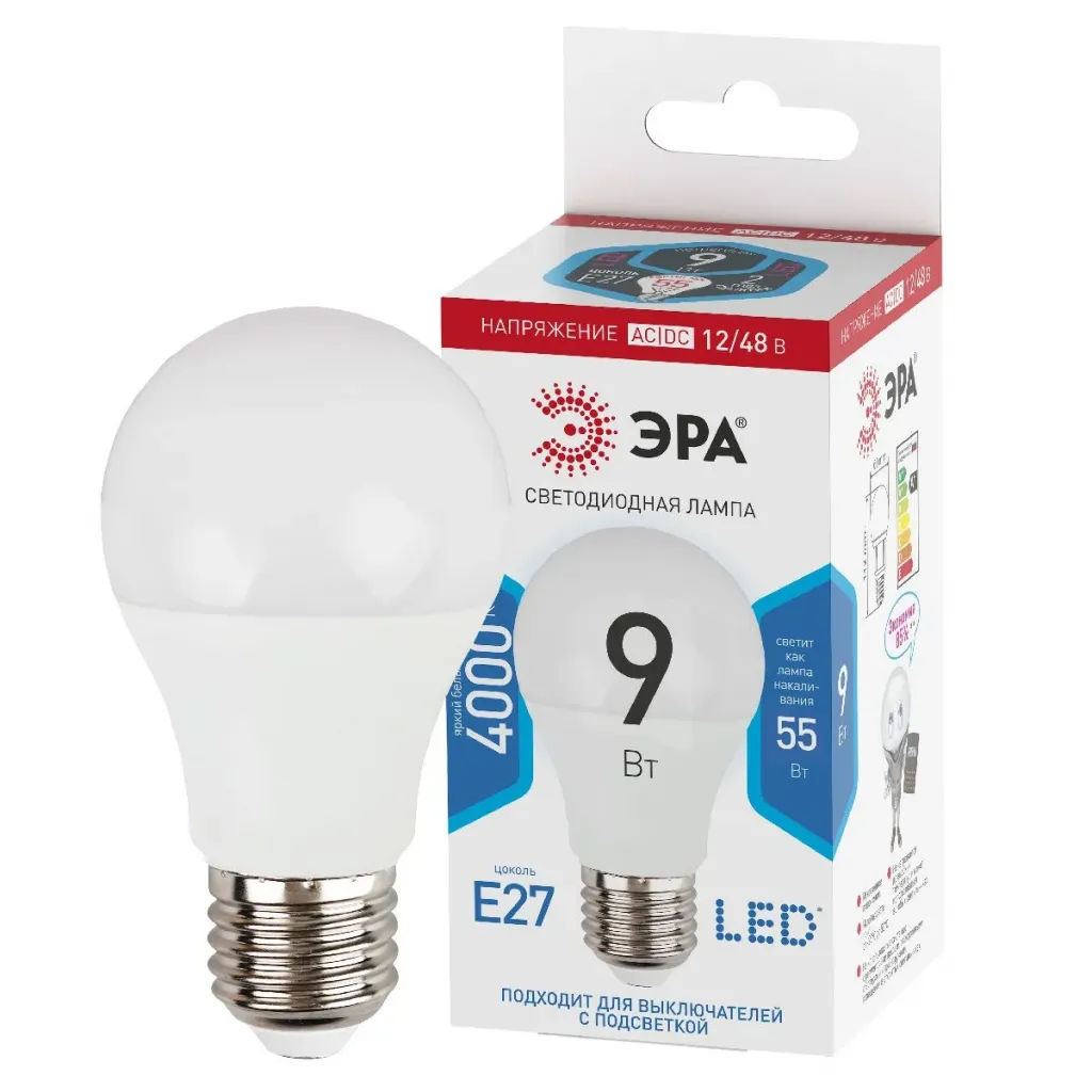 Лампа светодиодная Эра E27 9W 4000K LED A60-9W-12/48V-840-E27 Б0049096