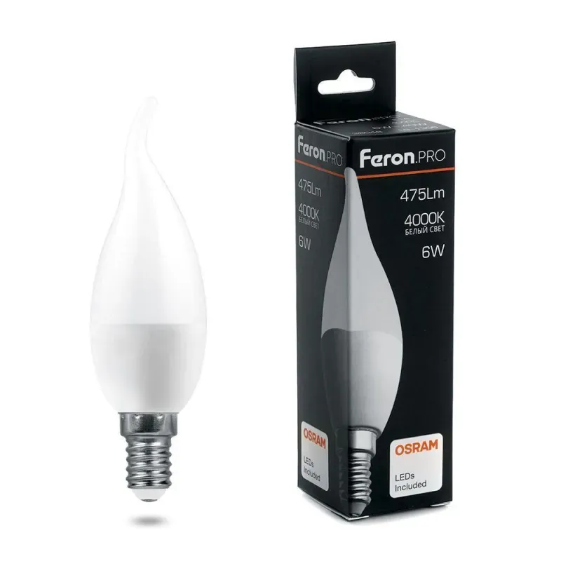 Лампа светодиодная Feron E14 6W 4000K свеча на ветру матовая LB-1306 38048