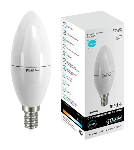 Лампа светодиодная Gauss E14 6W 4100K свеча матовая LD33126