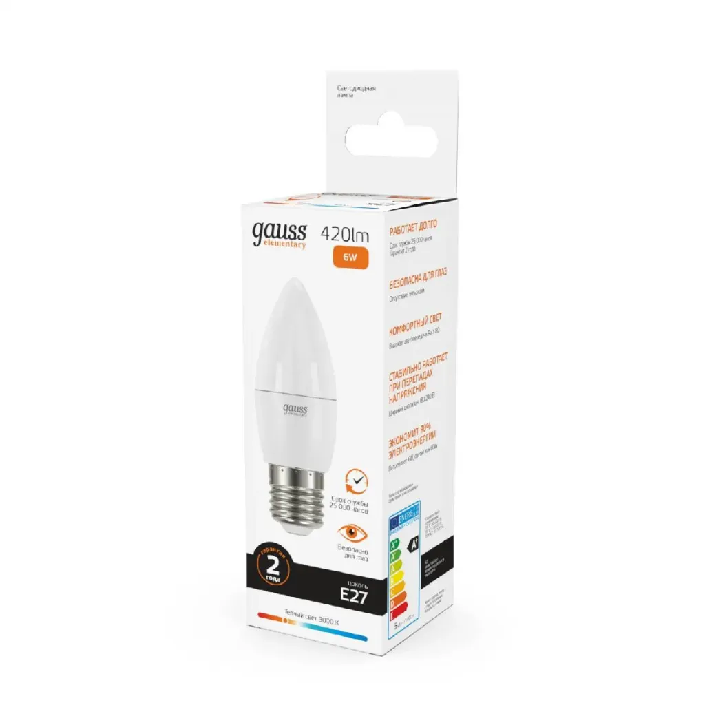 Лампа светодиодная Gauss E27 6W 3000K свеча матовая 33216