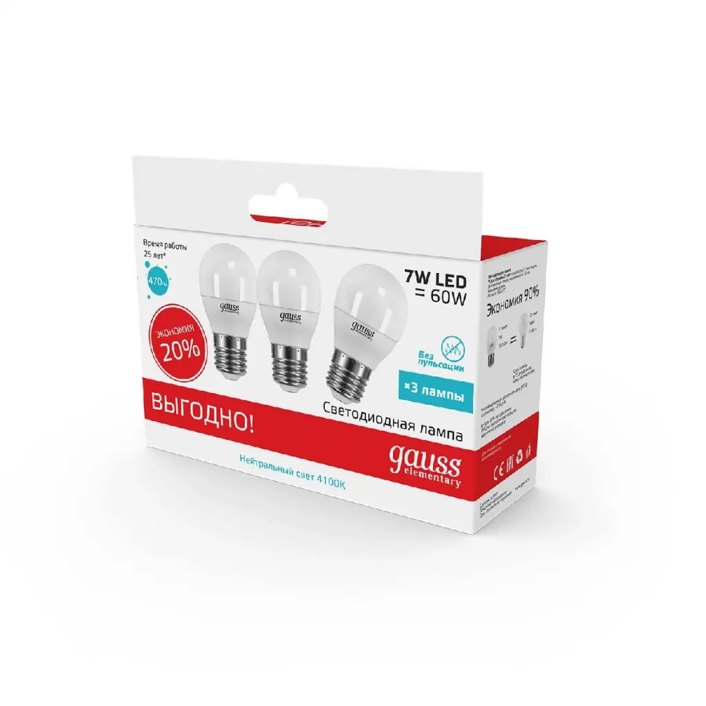 Светодиодная лампа (3 шт.) Gauss Elementary E14 6W 3000К свеча 33116T