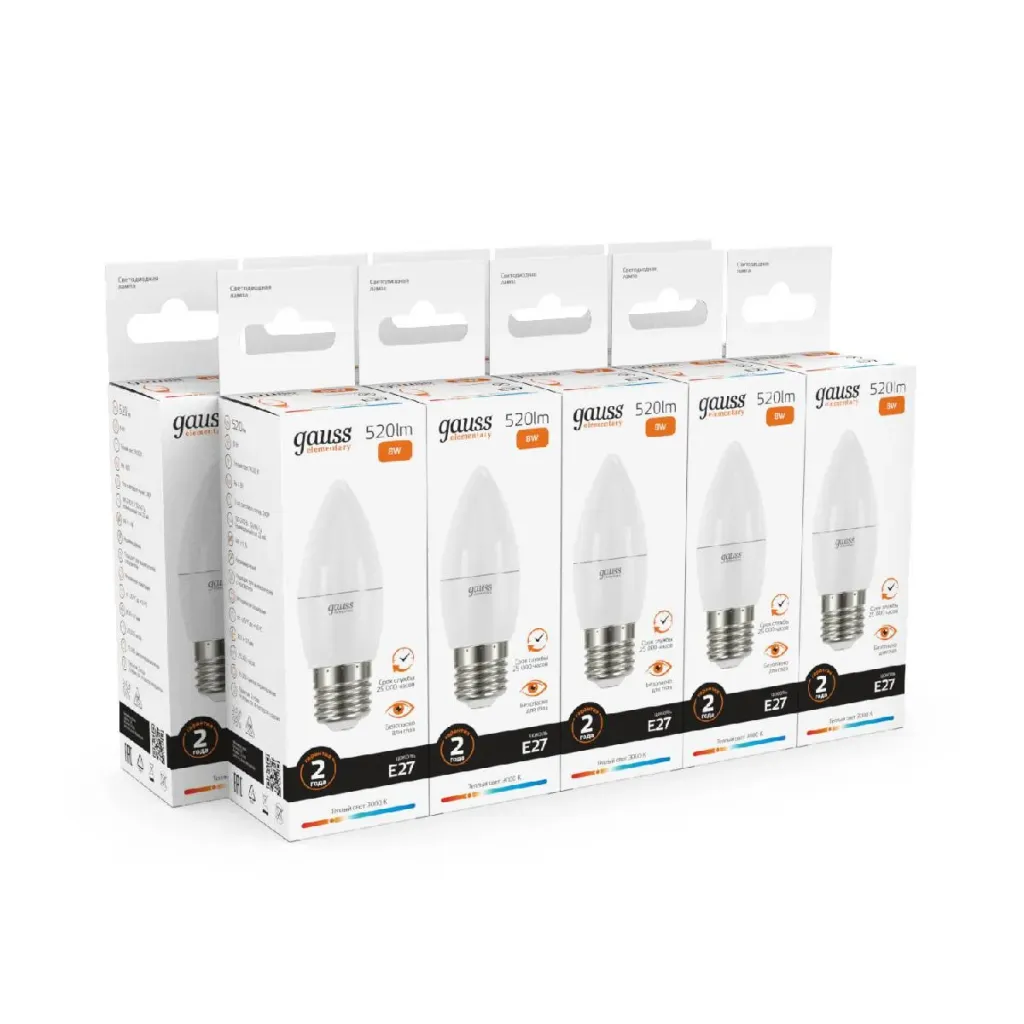 Лампа светодиодная Gauss E27 8W 3000K свеча матовая 33218