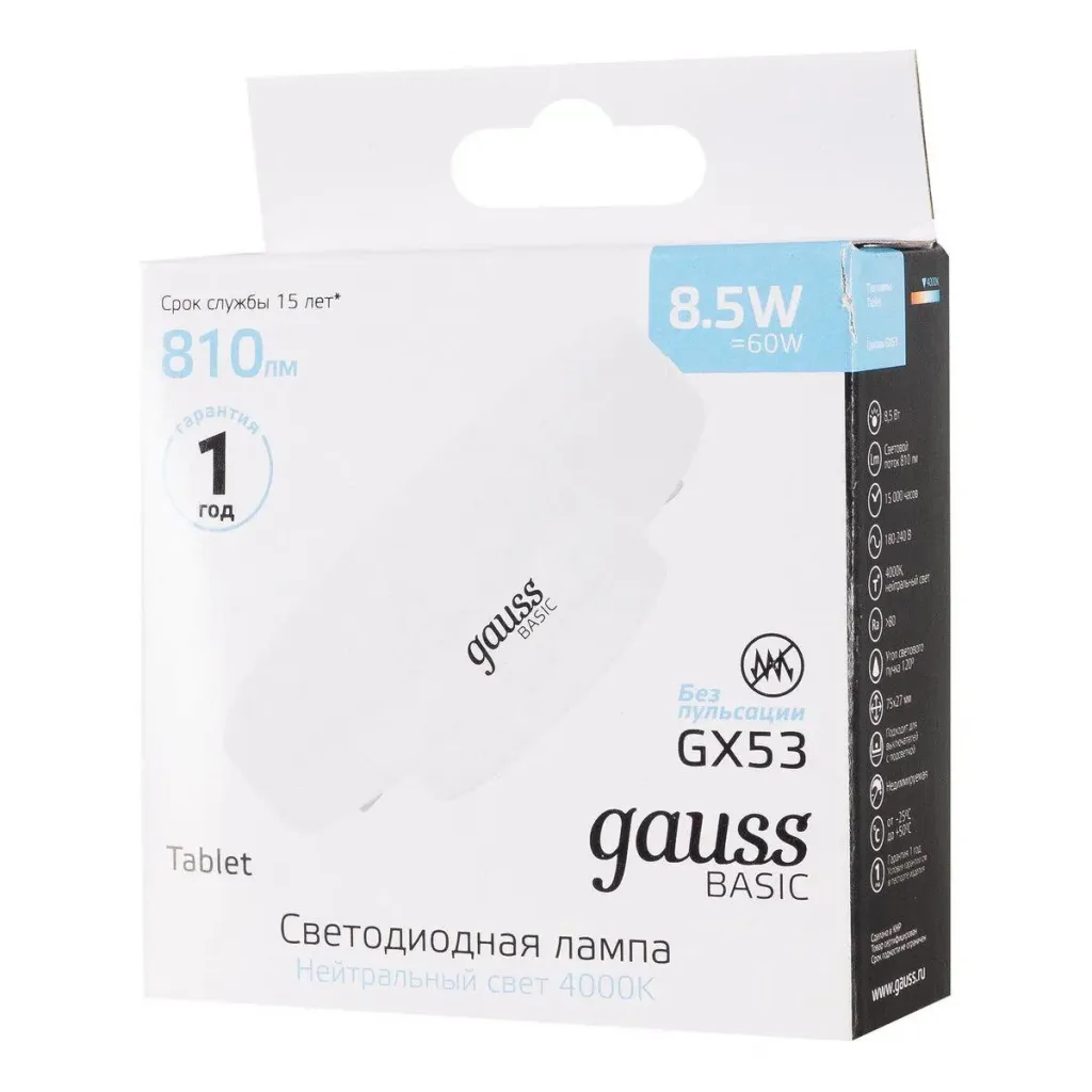 Лампа светодиодная Gauss GX53 8,5W 4100К матовая 20849292