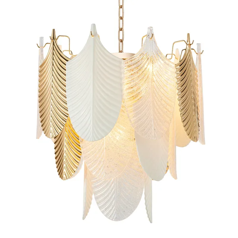 Люстра круглая многоярусная с декором в виде листьев золотистого и белого цвета Agatha Chandelier