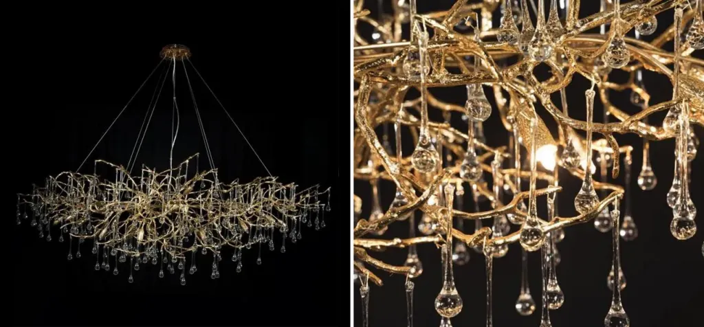 Подвесная люстра в виде ветвей деревьев золотого цвета с прозрачными подвесками-каплями 10 и 14 ламп Droplet Chandelier