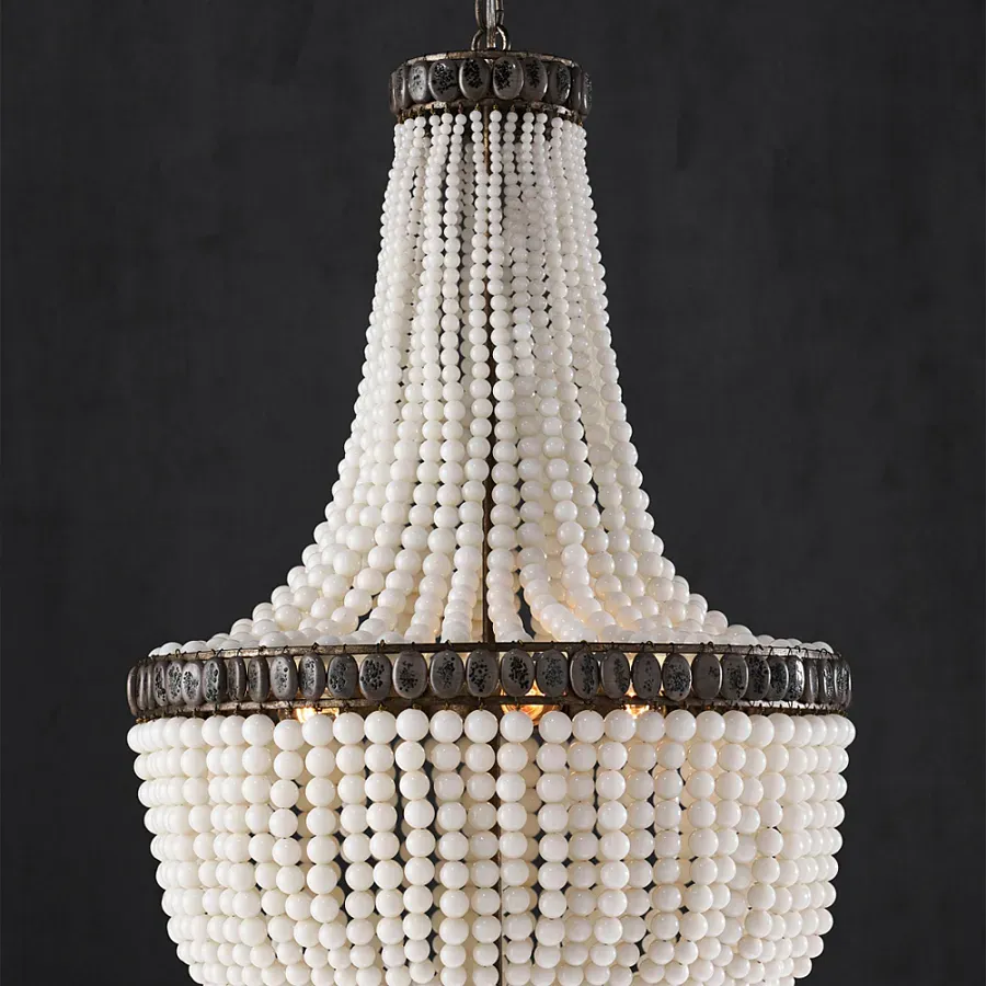Люстра каплевидной формы декорированная нитями стеклянных бусин молочного цвета Bead threads