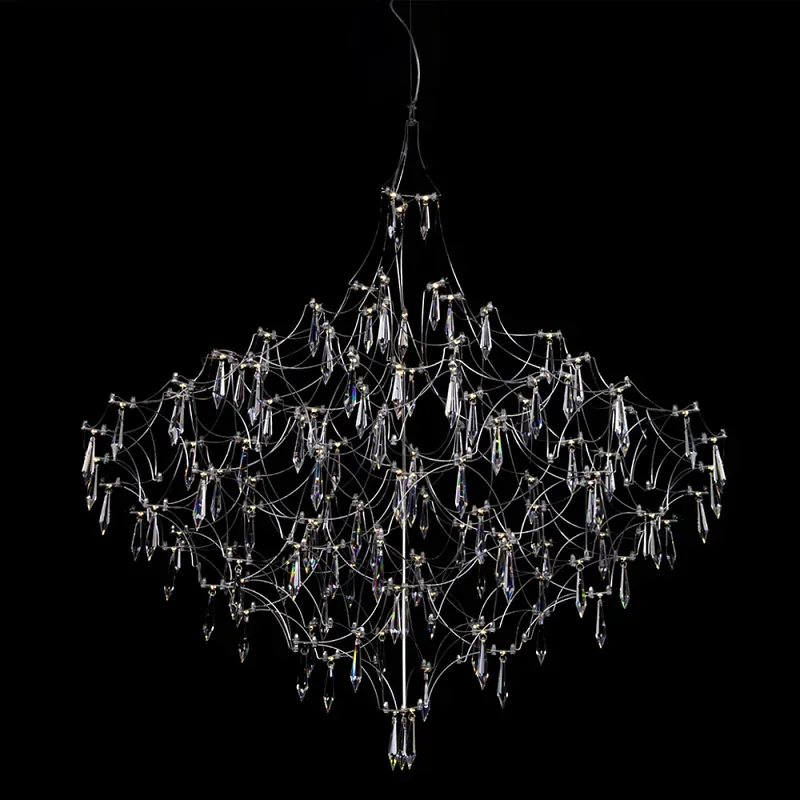 Люстра подвесная с изогнутыми металлическими линиями и хрустальными подвесками в виде капель Диаметр 100 см Quasar