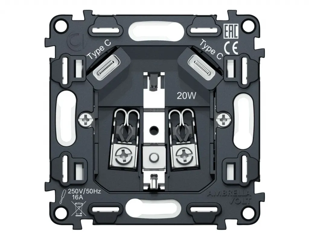Комплект механизма розетки 2USB A+C 20W (быстрая зарядка) Ambrella Volt Omega MO131010