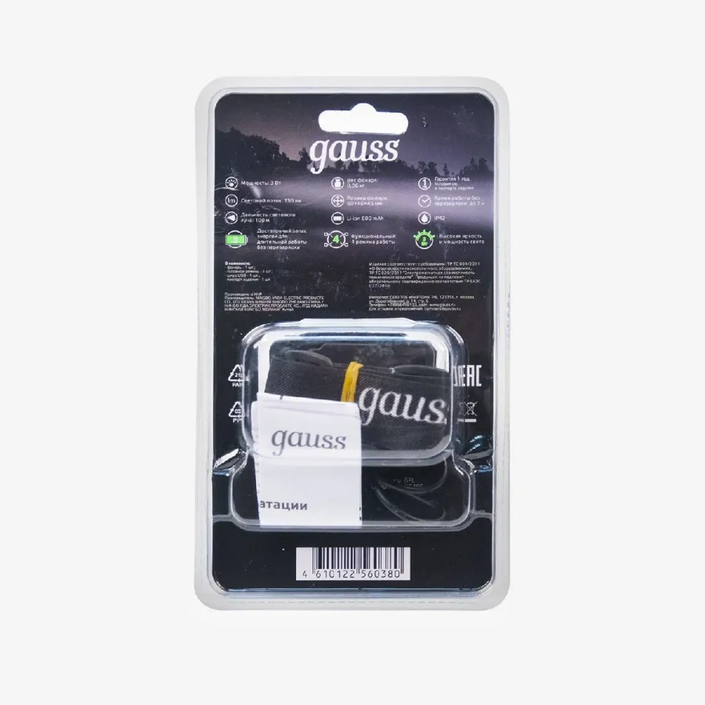 Налобный светодиодный фонарь Gauss аккумуляторный 30х60 150 лм GF408