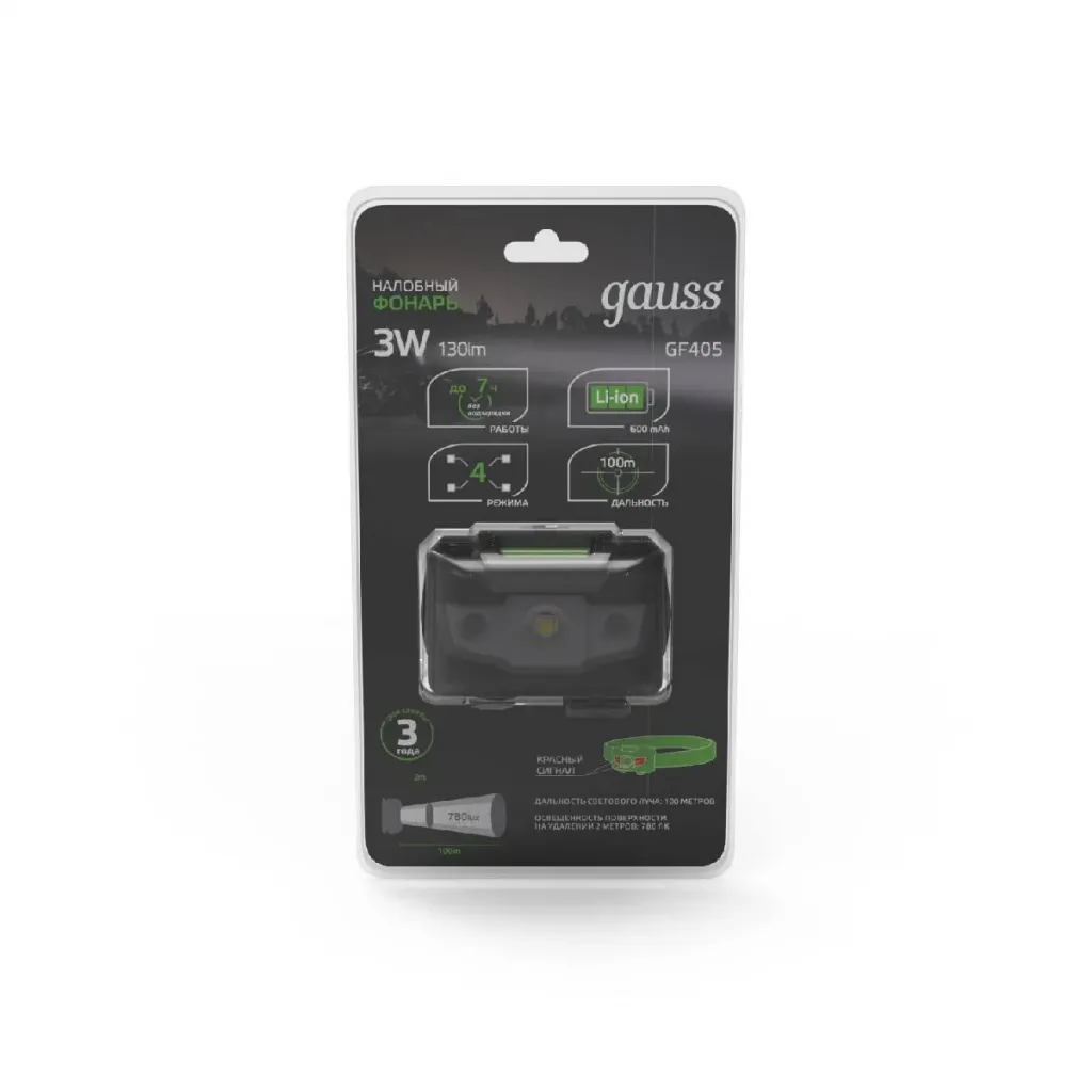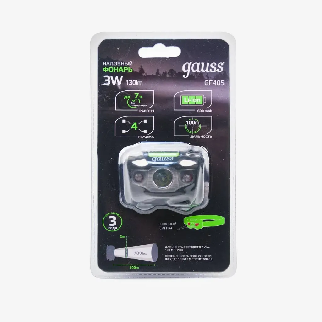 Налобный светодиодный фонарь Gauss аккумуляторный 40х60 130 лм GF405