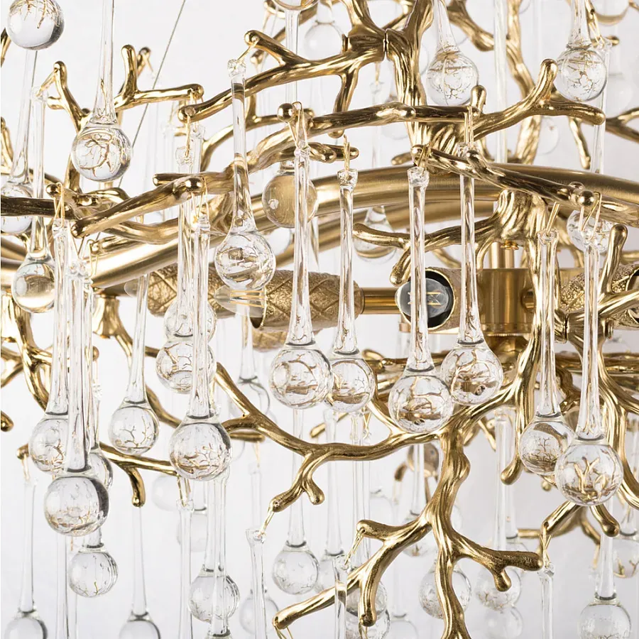 Подвесная люстра в виде ветвей деревьев золотого цвета с прозрачными подвесками-каплями 10 и 14 ламп Droplet Chandelier