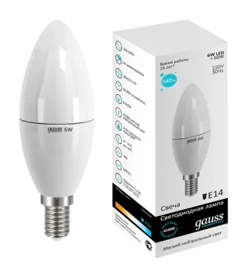 Лампа светодиодная Gauss E14 6W 4100K свеча матовая LD33126