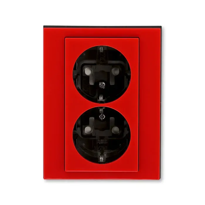 Розетка двойная с рамкой с заземлением и шторками ABB Levit, красный-дымчатый чёрный 2CHH223457C6065