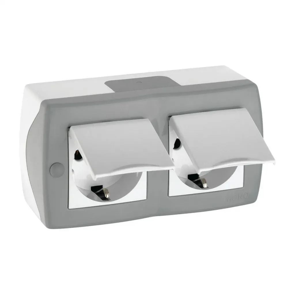 Розетка на 2 поста с заземлением и крышкой Mono Electric Octans IP20 16А 250В бело-серый 104-020001-184