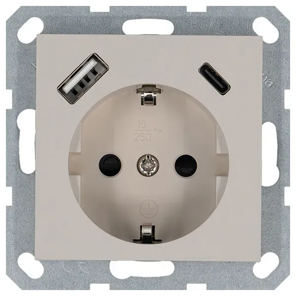 Розетка с заземлением Jasmart 16А+2USB A+С(5V 3A, 12V 1,5A, max. 18W), тауп G5501USB-25T