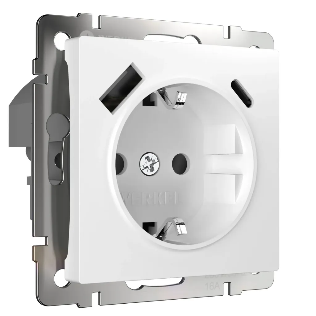 Розетка с заземлением, шторками и USB Type A+С 16A/3А/250В, винтовой зажим Werkel, белый A056272