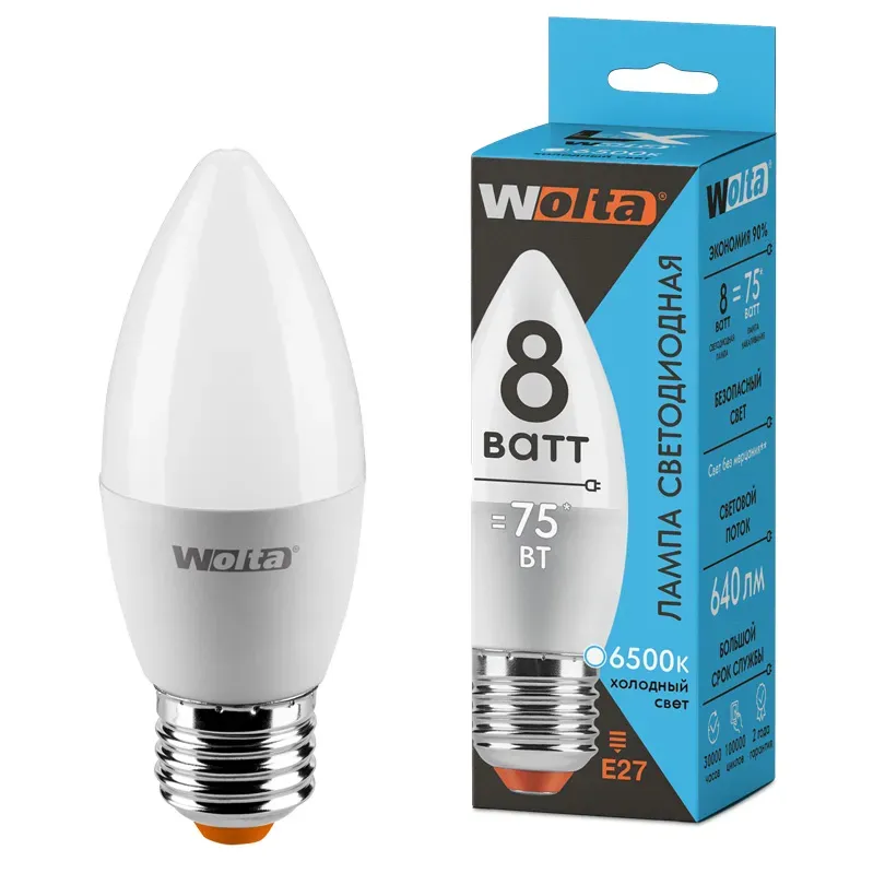 Светодиодная лампа WOLTA LX 8Вт 6500K Е27 свеча матовая 30WC8E27