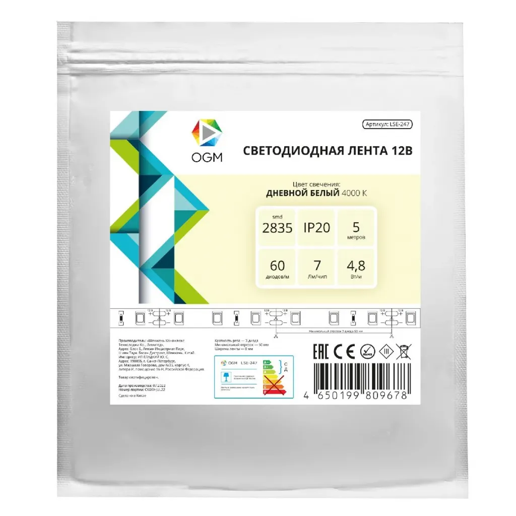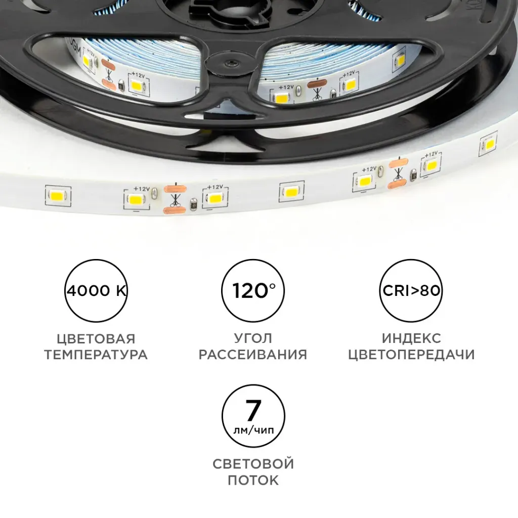 Светодиодная лента Apeyron 12В 2835 4,8Вт/м 4000К 7Лм/чип 5м IP20 LSE-247