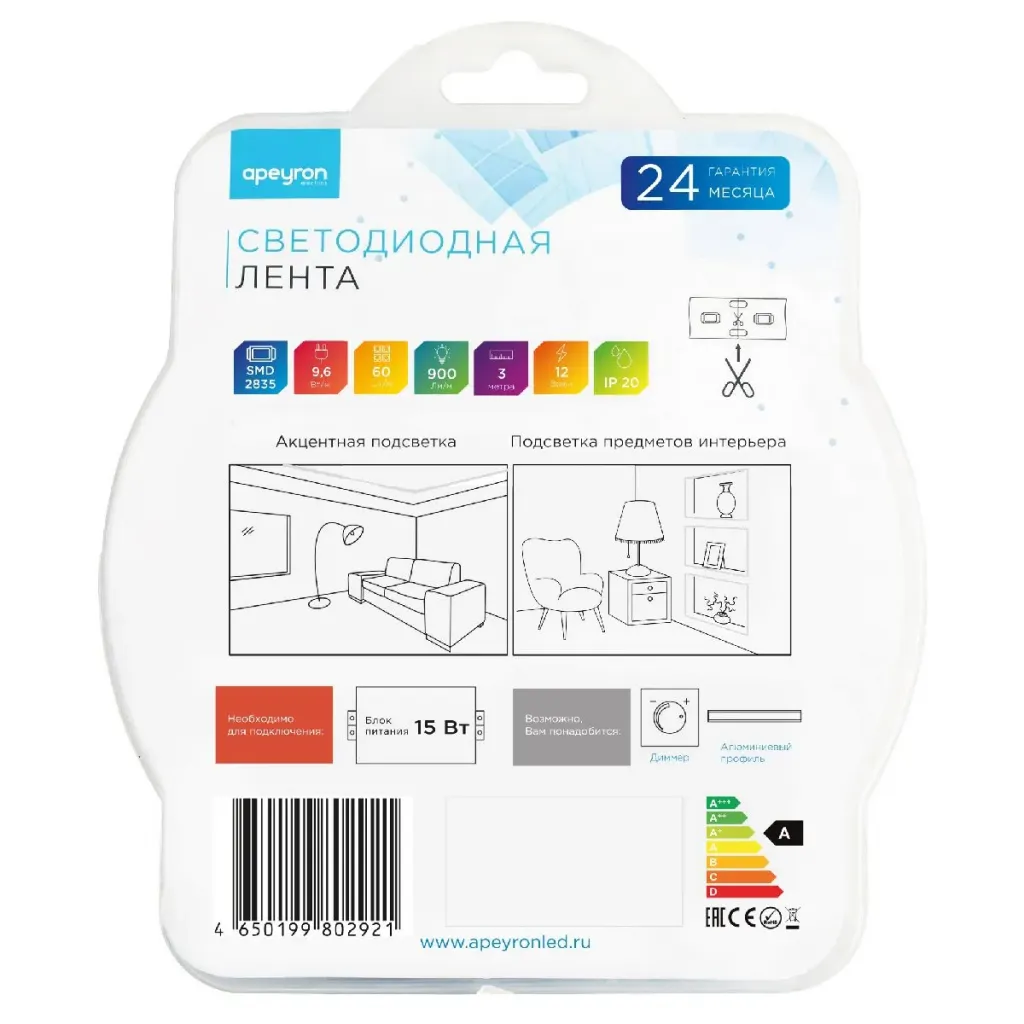 Светодиодная лента Apeyron Стандарт 12В 2835 9,6Вт/м 6500К 5м IP20 00-55