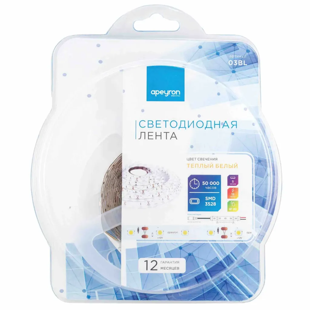 Светодиодная лента Apeyron 12В СТ 4,8Вт/м smd3528, 60д/м IP20 5м синяя 00-01