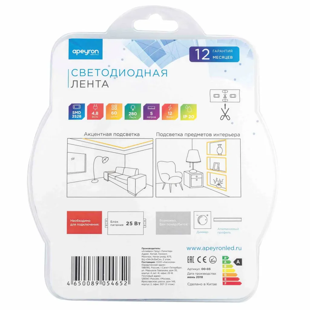 Светодиодная лента Apeyron Стандарт 24В 5050 14,4Вт/м 3000К 5м IP20 00-338