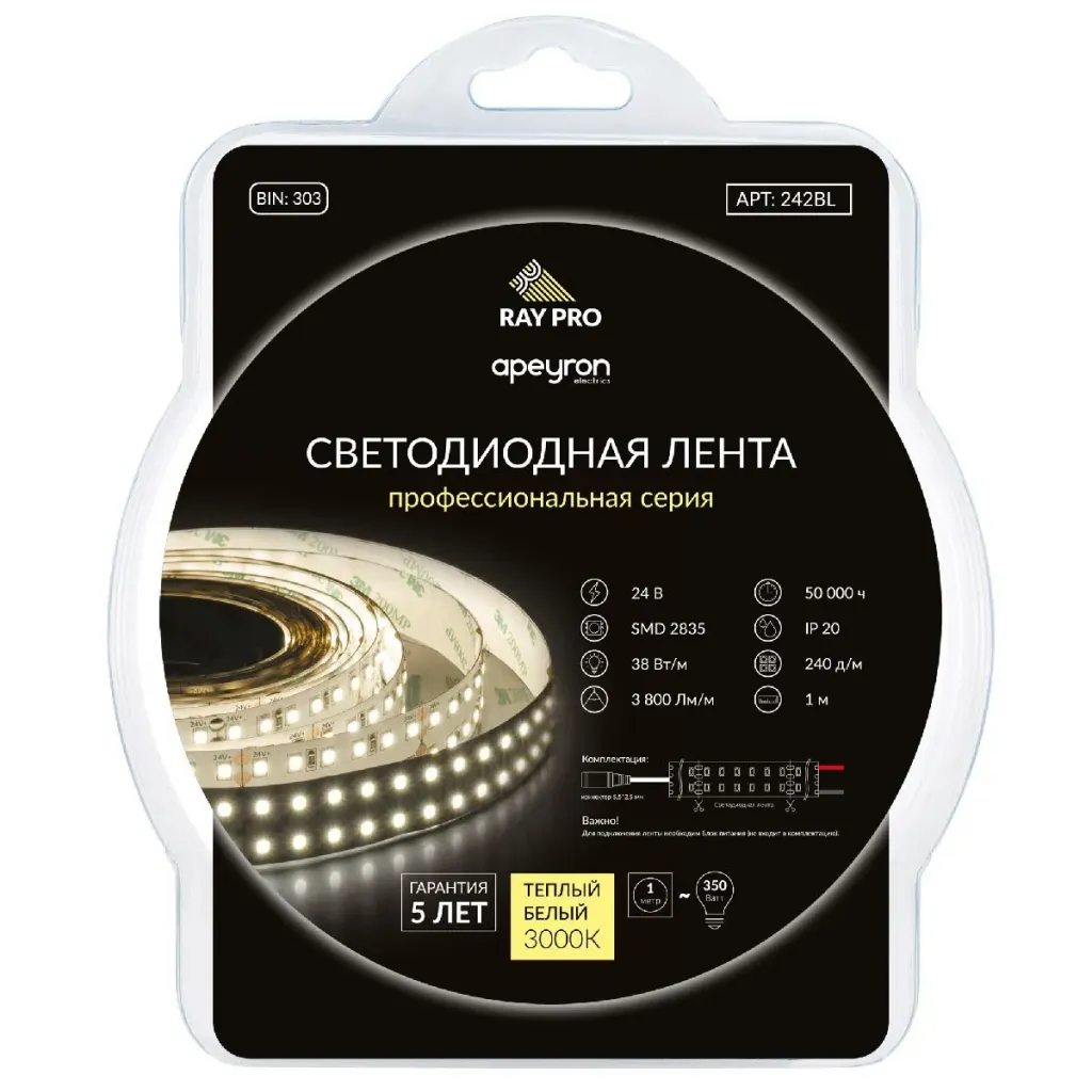 Светодиодная лента Apeyron 24В ПРО 38Вт/м smd2835 240д/м IP20 3800Лм/м 5м 3000К 00-304