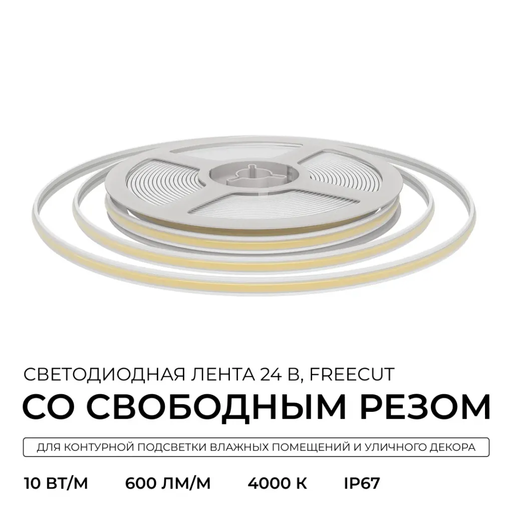 Светодиодная лента Apeyron Free Cut 24В, 10 Вт/м, 600 лм/м, 4000К, COB, 528 д/м, CRI90+, IP67, 5м 00-408