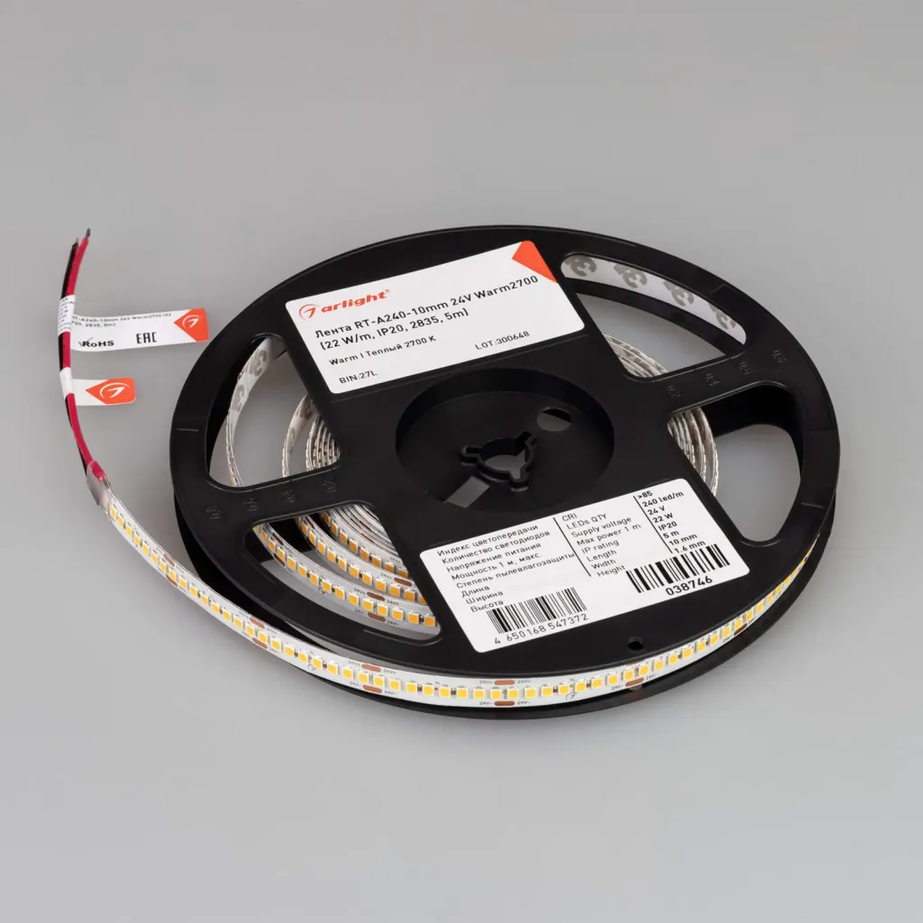 Светодиодная лента Arlight RT-A240-10mm 24V Warm2700 (22 W/m, IP20, 2835, 5m) 038746