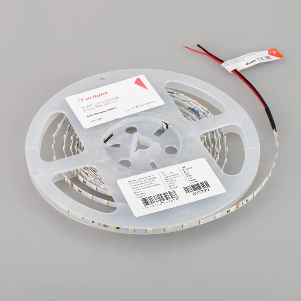 Светодиодная лента Arlight RT-A80-5mm 24V Cool 8K (5 W/m, IP20, 2835, 5m) 037799