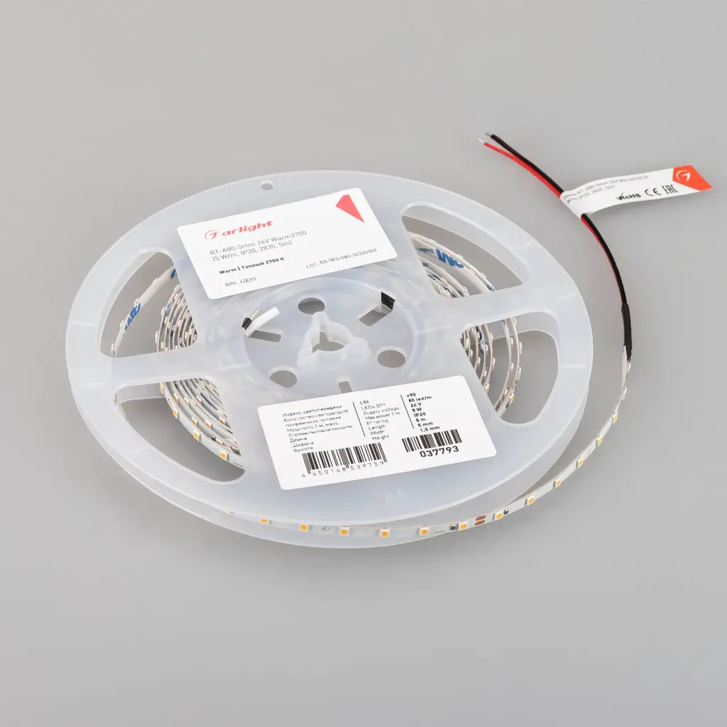 Светодиодная лента Arlight RT-A80-5mm 24V Warm2700 (5 W/m, IP20, 2835, 5m) 037793