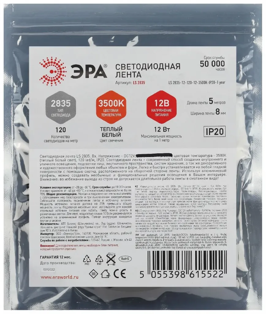 Светодиодная лента Эра 12В 2835 12Вт/м 6500K 5м IP20 LS2835-12-120-12-6500K-IP20-1 year Б0053970