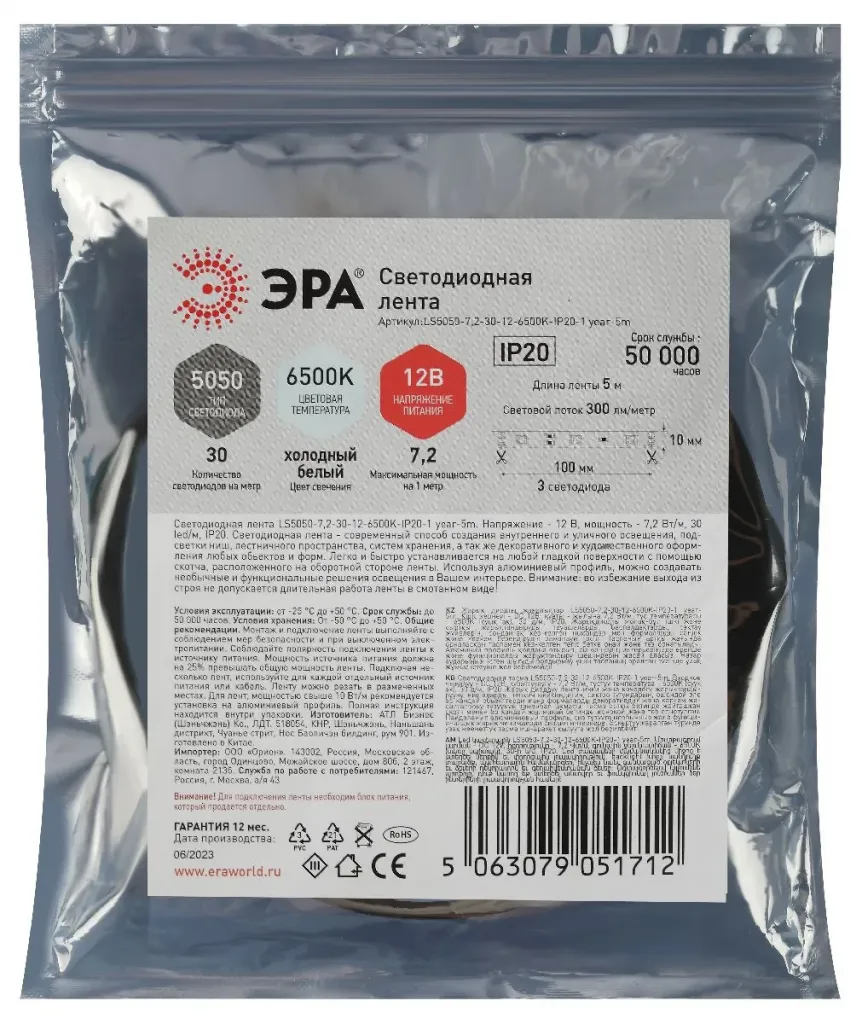 Светодиодная лента Эра 12В 5050 7,2Вт/м 6500K 5м IP20 LS5050-7,2-30-12-6500K-IP20-1 year-5m Б0059917