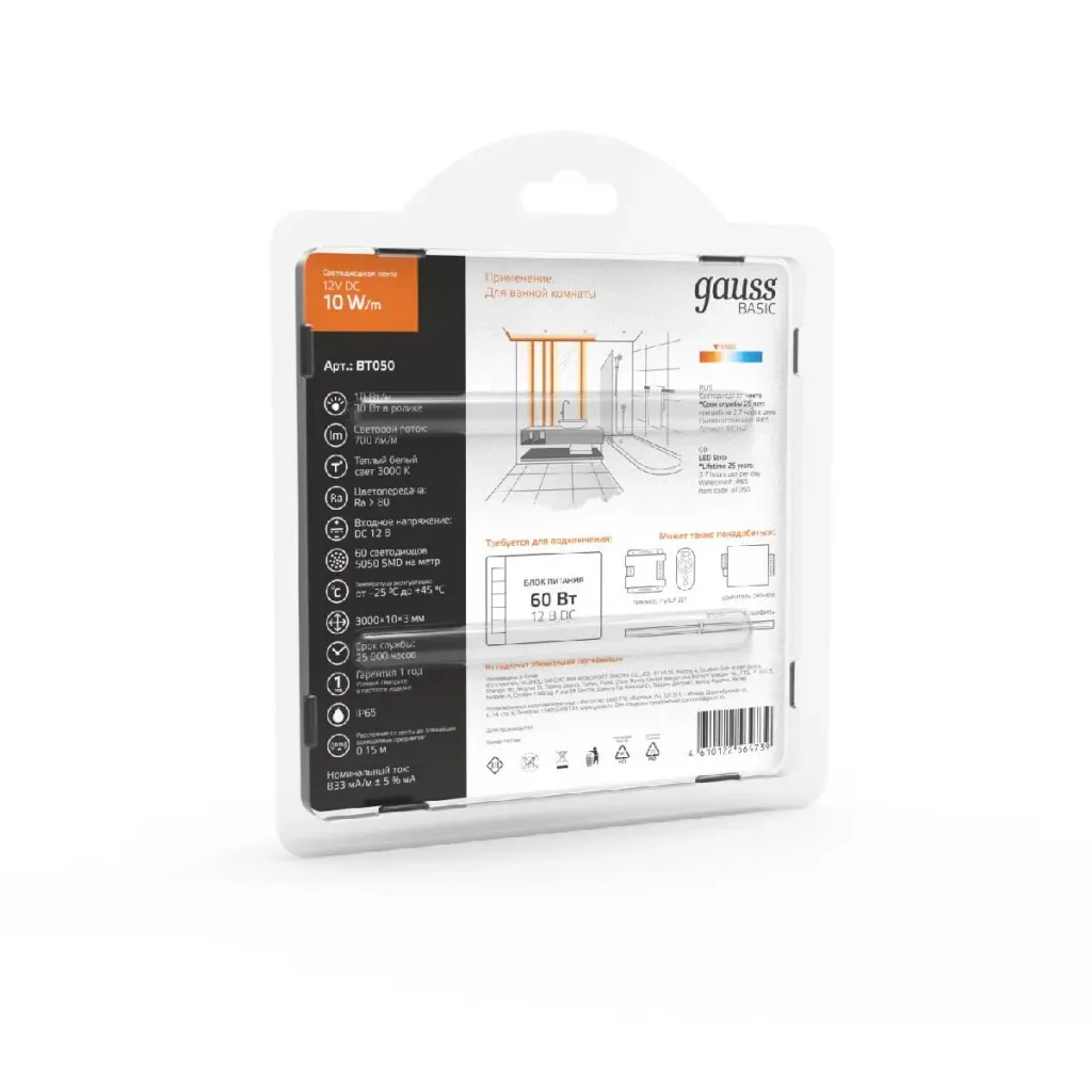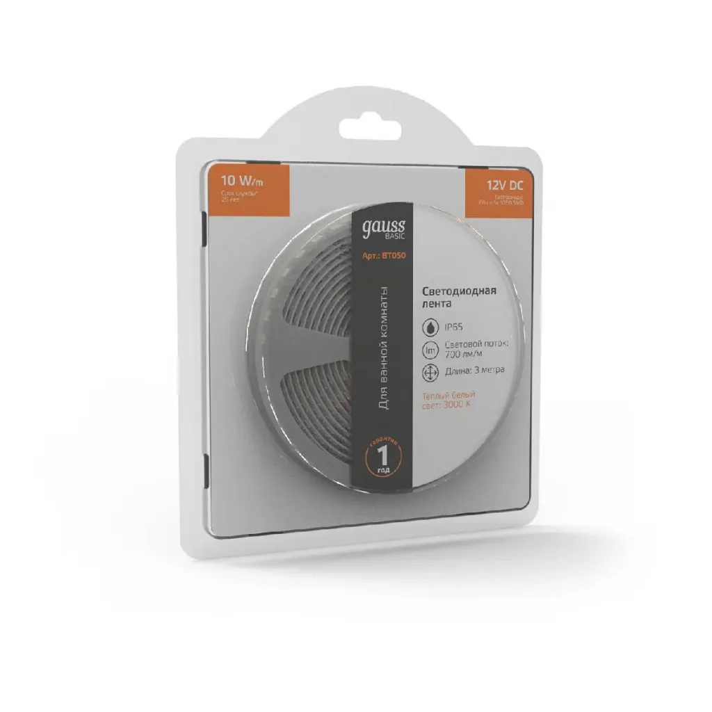 Светодиодная лента Gauss Basic 12В 5050 10Вт/м 3000K 5м IP65 BT051